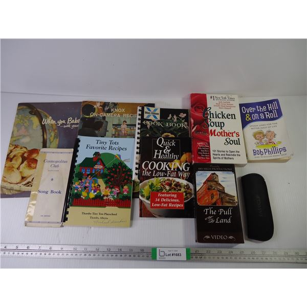 Cookbooks, Chicken Soup Book, VHS movie, Reading Glasses and misc.