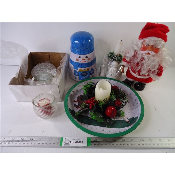 Christmas Decor-Candle Holder/Candles, Santa Figure and Serving Tray1687 - Christmas Decor-Candle Holder/Candles, Santa Figure and Serving Tray