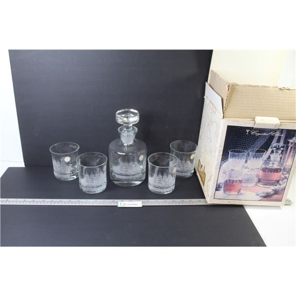 Romania Crystal Decanter 4 Glass Set w/Etched Sail Boats in Box