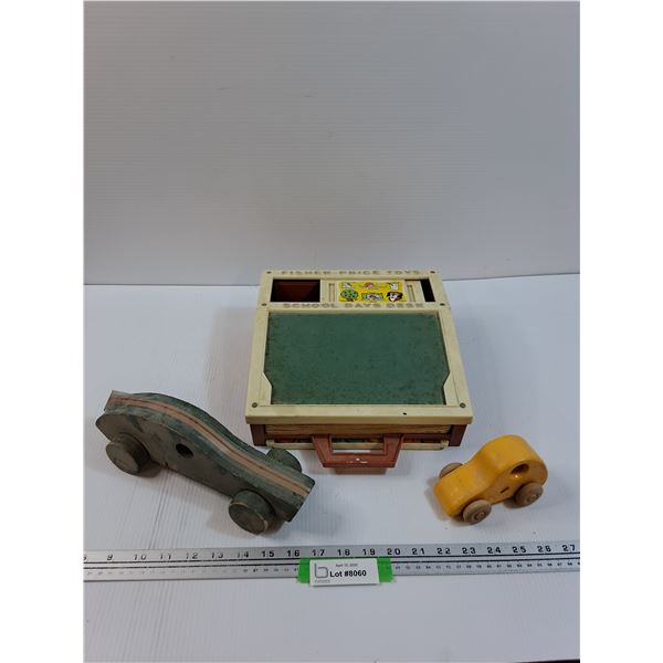 Vintage Fisher Price School Days Desk & (2) Wooden Car Toys