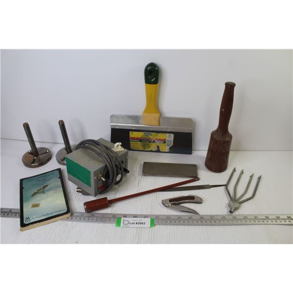 Knife (damaged) - 10" Drywall Mud Knife - Unknown Timer - Kite Making Book - Misc. Items