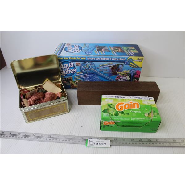 Aqua Globes 2Pack (NIB) - Piece of Wood - Open Box of Dryer Sheets - Vintage Tin of Tassels