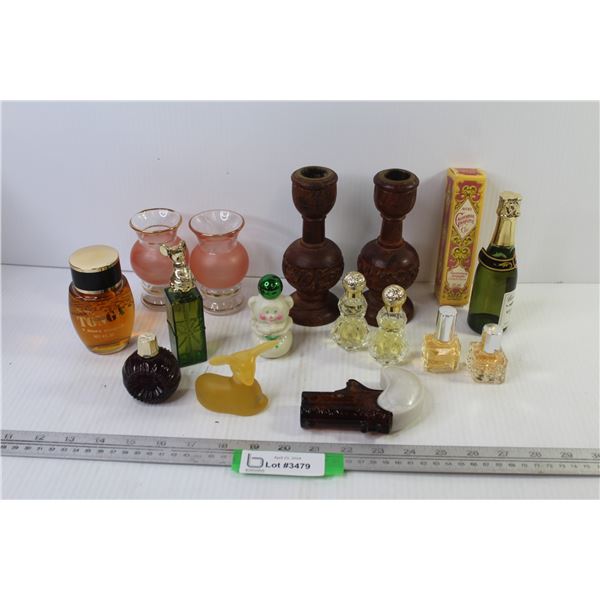 Wooden Candle Holders, Vases, Variety of Avon Products, Cologne, Musk, etc.