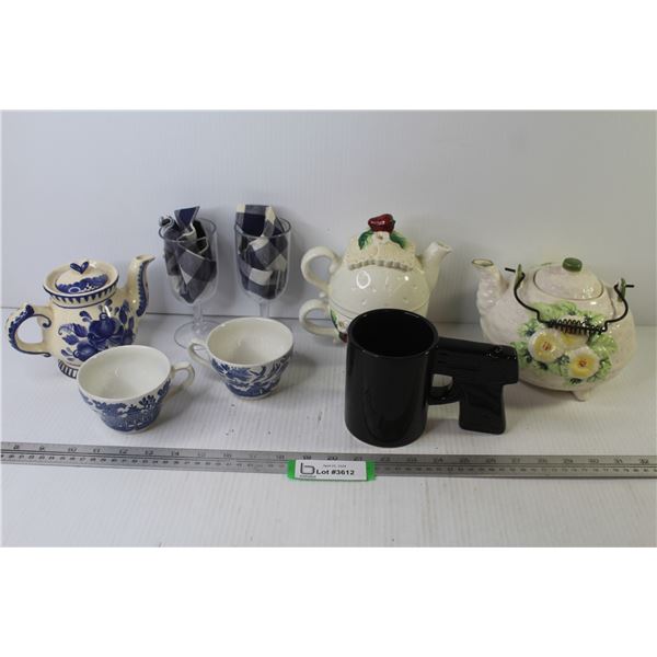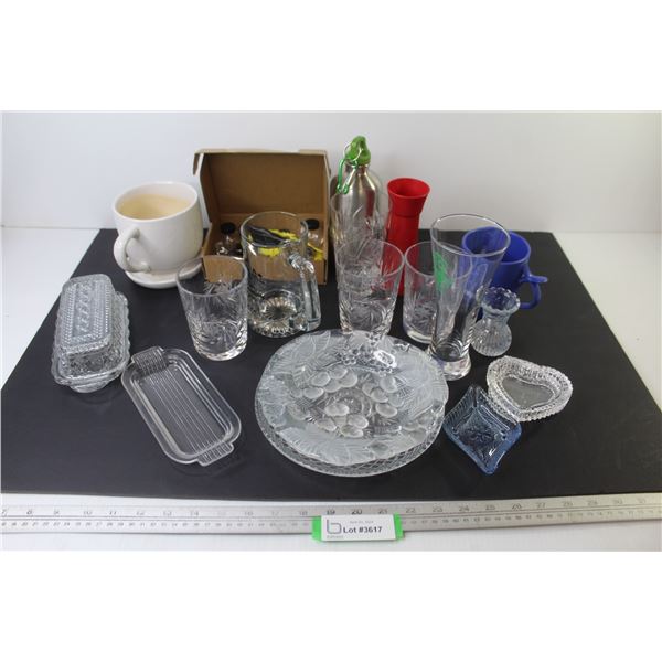 Assorted Glass Ware - Butter Dish - Cup Plant Pot - Small Forks & Corncob Picks - Metal Beverage Bot
