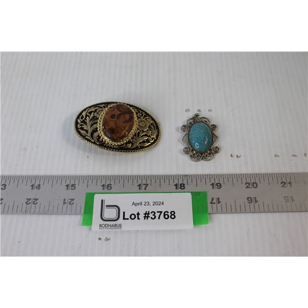3775 - Scarf Clip, Shell Brooch, Snowflake Obsidian Belt Buckle, Capricorn Necklace, 23" Stone Necklace, (2Bodnarus Auctioneering & Real Estate