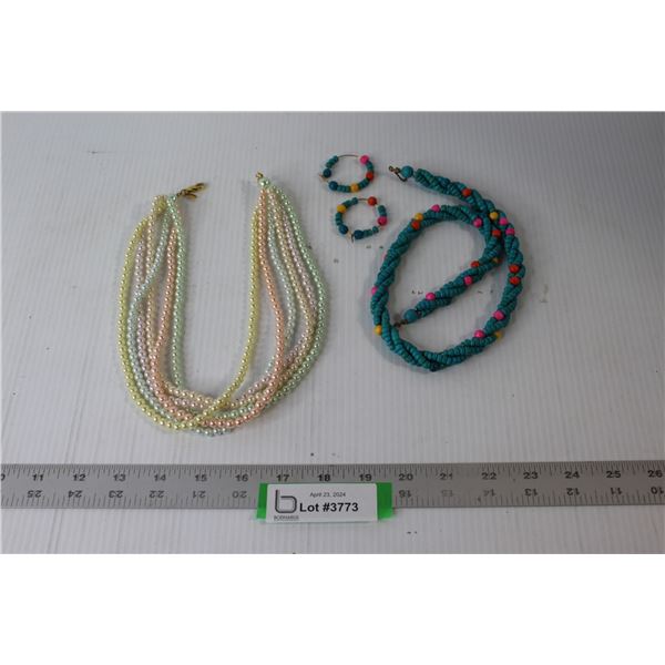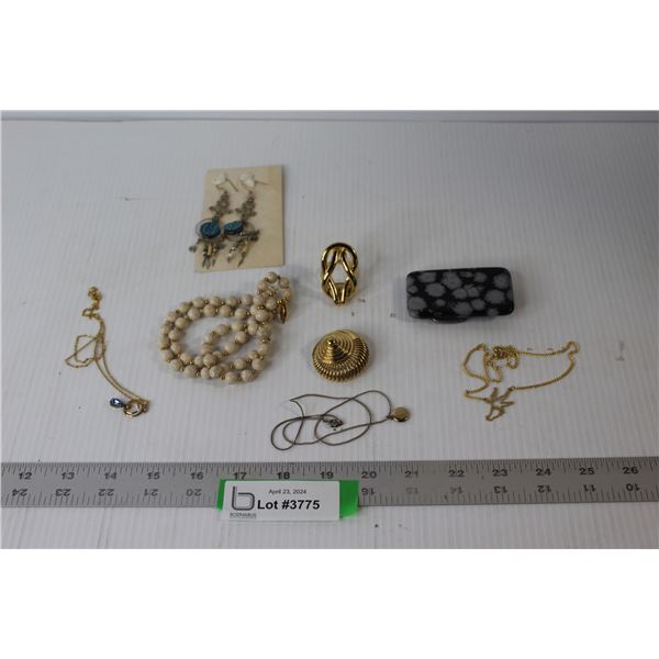 Scarf Clip, Shell Brooch, Snowflake Obsidian Belt Buckle, Capricorn Necklace, 23" Stone Necklace, (2) Pendants on Chains, Earrings
