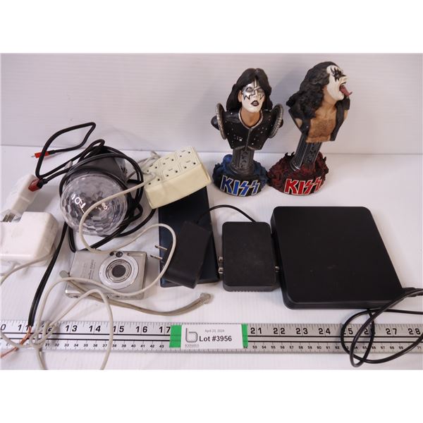 (2) KISS Figurines, Modem, Chargers, Camera, Light