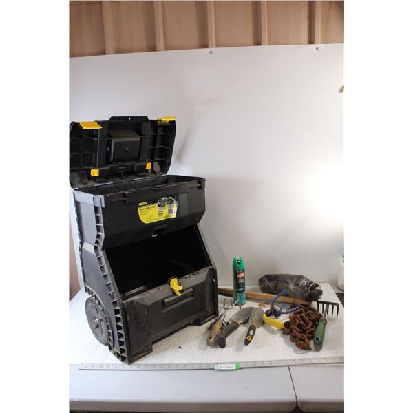 *Stanley Mobile Work Center Plastic Tool Caddy (No Tray) w/Wheels - Including 4' Chain w/Hooks, Garden Tools, Deep Wood Off Bug Spray, Bag of St...