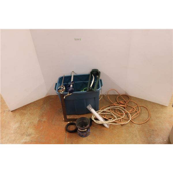 *Tote w/Carpenters Square, Bar Clamp, Paint Mixer, 20' Extension Cord, String, Sprinkler etc.