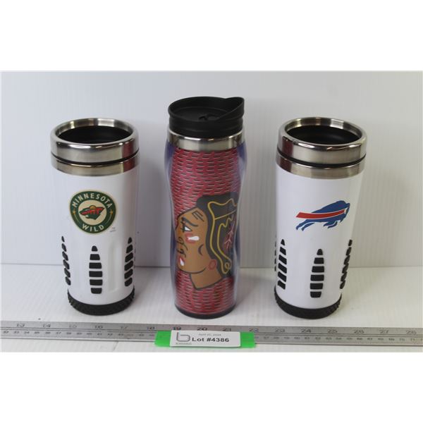 (3) NHL and NFL Beverage Cups - Minnesota Wilds - Chicago Black Hawks - Buffalo Bills