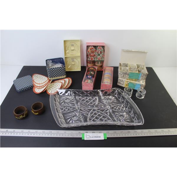 Paper Cup Coasters - Wooden Napkin Rings - (12 Pinwheel Crystal Napkin Rings - Pinwheel Crystal Divided Plate (has chips)