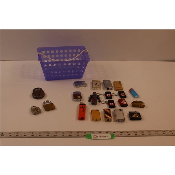 (17) Vintage and Newer Lighters & (3) Locks (No Keys) w/ Purple Basket