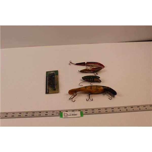 (4) Vintage Plug Fishing Lures (2- Wooden Repainted Or Paintless of Unknown Manufacturer, 1- 7.5" Ho