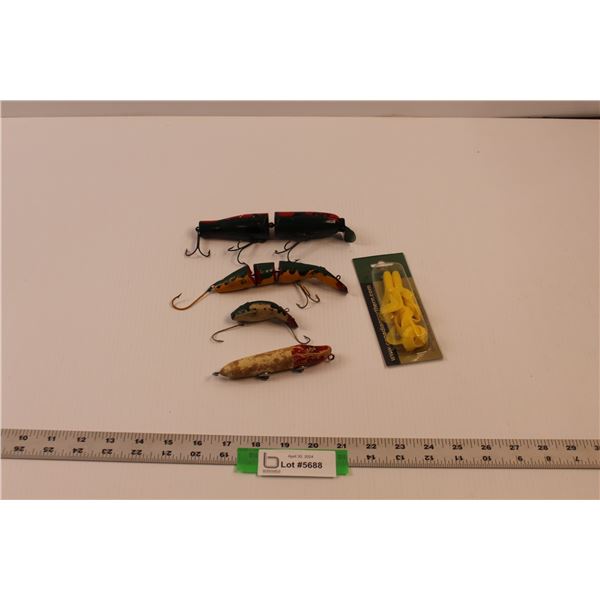 (4) Vintage Wooden Plug/Jointed Fishing Lures (1- Lucky Strike, Others Unknown Manufacturer as they Have been Repainted) & Canadian Northern Jig...