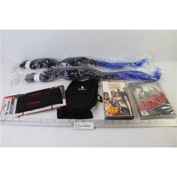 Harbinger Padded Lifting Straps (NIB) - (2) Easy Braids (NIB) - Wolf Bike Knee Pad - VHS Tape (Best Man) - DVD (Black List)