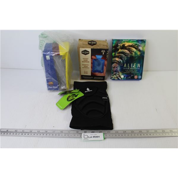 (1) Pint Glass (NIB) - Blue Ray Alien 6 Film Collection - Disposable Hand Warmer (NIB) - Wolf Bike Knee Pad (NIB)