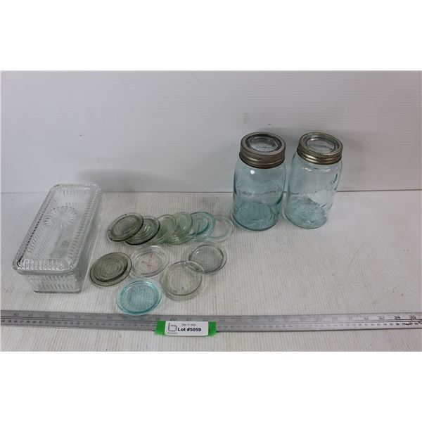 (2) Vintage Canning Jars, Crown, Imperial Gem, (12) Extra Glass Lids, Glass Dish w/ Lid