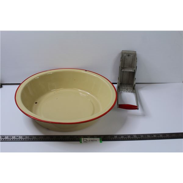 Enamel Wash Bowl (Worn/Rust Spots), Fry Slicer (Wall/Counter Mount)