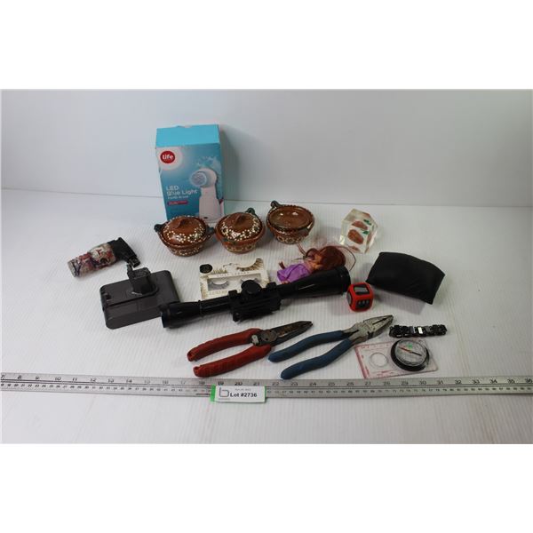Compass - Pliers - Clay Dishes - Dyson Battery - Led Blue Light Facial Brush (NIB) - Misc. Items