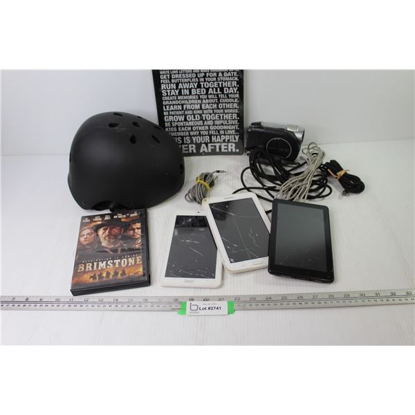 Skateboard Helmet (missing liner) - Sony Handy Cam - Acer, Samsung & RCA Pads (untested & cracked) - Tin Love Sign - Brimstone DVD - USB Cab...