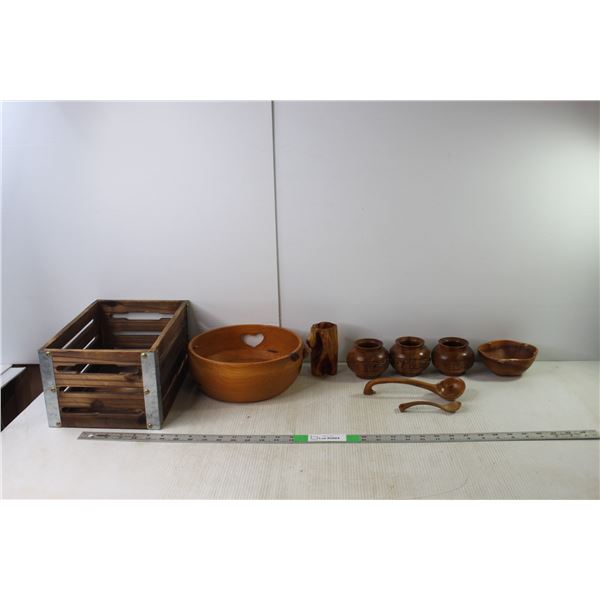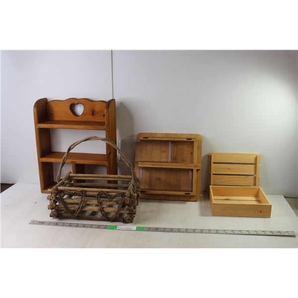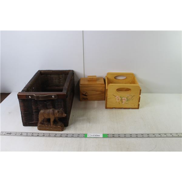 Wood Bear Figurine, (2) Wood Boxes, Wicker Box