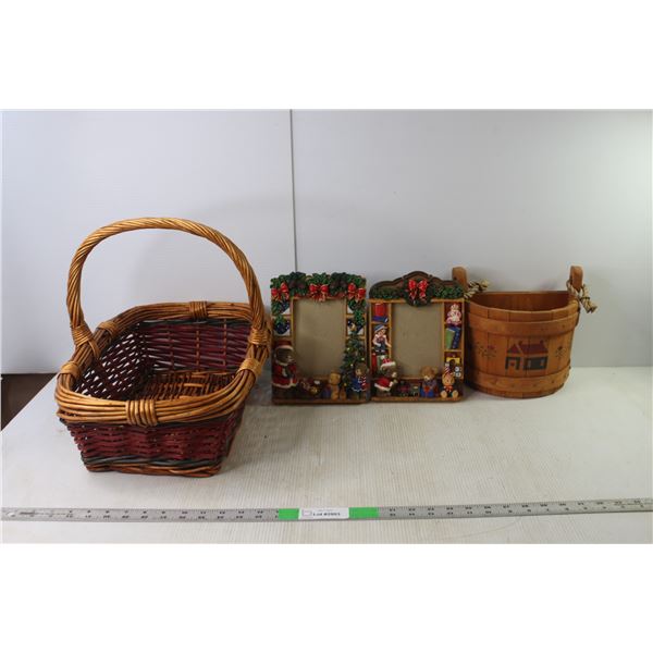(2) Christmas Photo Frames, Wicker Basket, Wood Container