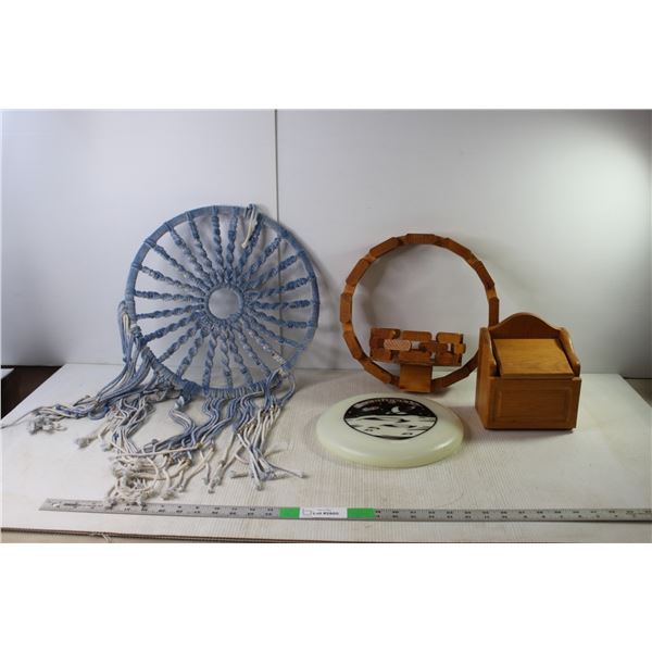 Macrame Decor, Glow In the Dark Frisbee, (2) Wood Decorations