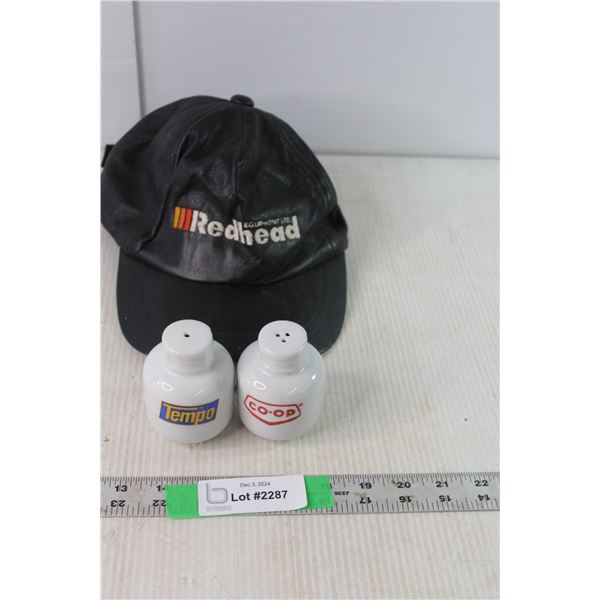 Redhead Equip. Leather Hat & Tempo/Co-op Salt & Pepper Shakers
