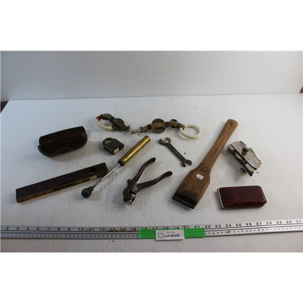 Wrench, Vintage Scrapers, Carpenter's Level, Protective Goggles, Yale Lock and Misc.