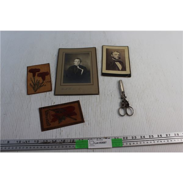 Antique Portraits, Vintage Scissors and Leather Embroidery Art