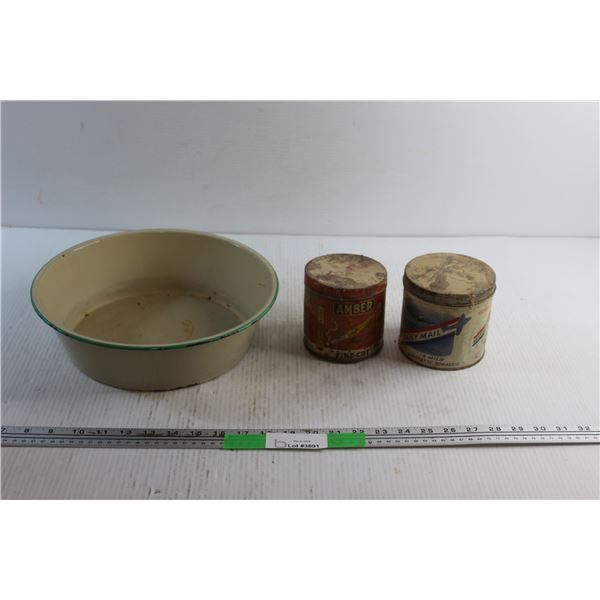 Enamel Bowl and (2) Vintage Tobacco Tins