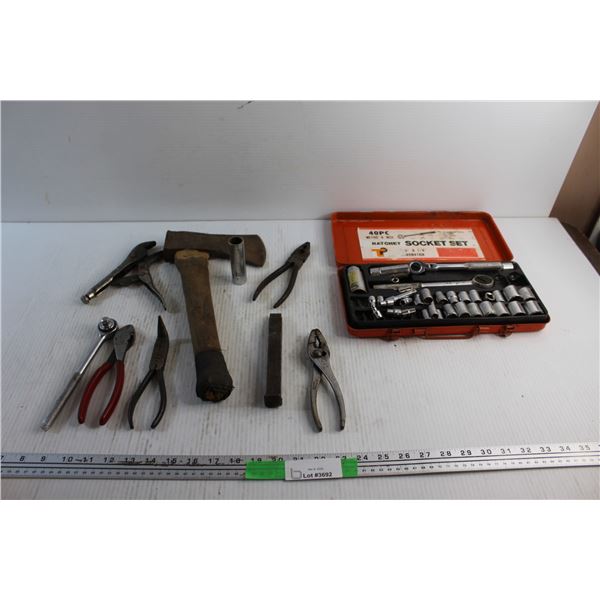 Ratchet Socket Set, Pliers, Hatchet and Chisel