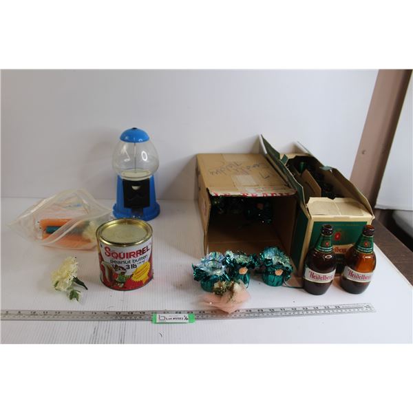 (12) Heidelberg Bottles, Bubblegum Machine, Squirrel Peanut Butter Tin, Candles and Candleholders