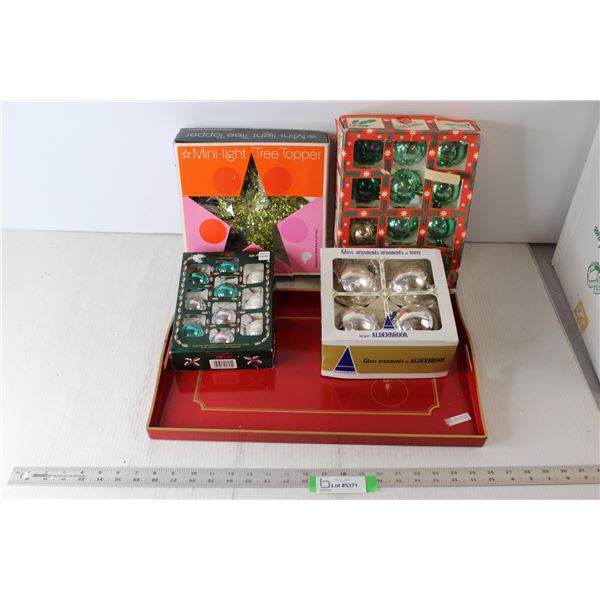 Assortment of Vintage Christmas Items - Garlands, Tinsel, Ribbons, Trays, Table Cloth, Electric Lighted Star