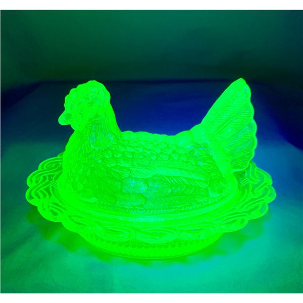 Westmoreland Uranium Vaseline Glass Covered Hen on Nest