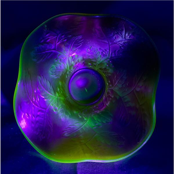Fenton Uranium Carnival Glass Holly 4-Sides Up Hat Vase - 1907
