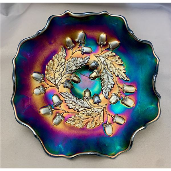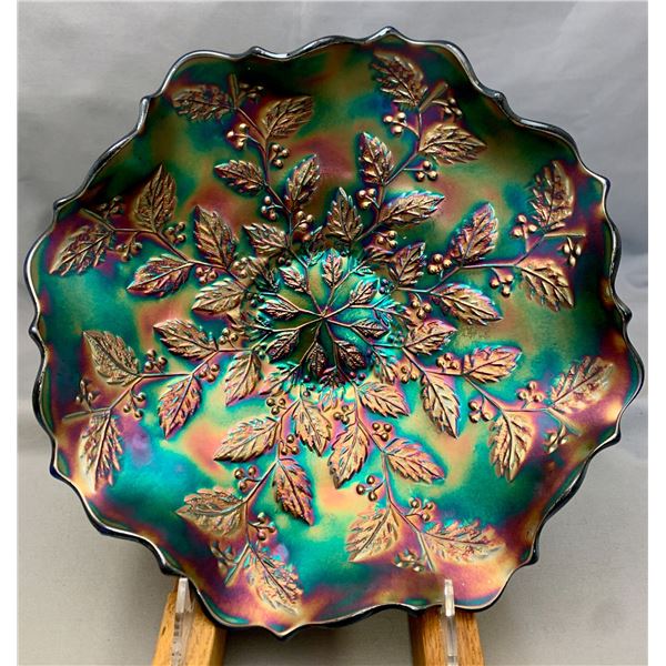 Fenton Cobalt Blue Carnival Glass Holly Ruffled 9" Bowl - 1907