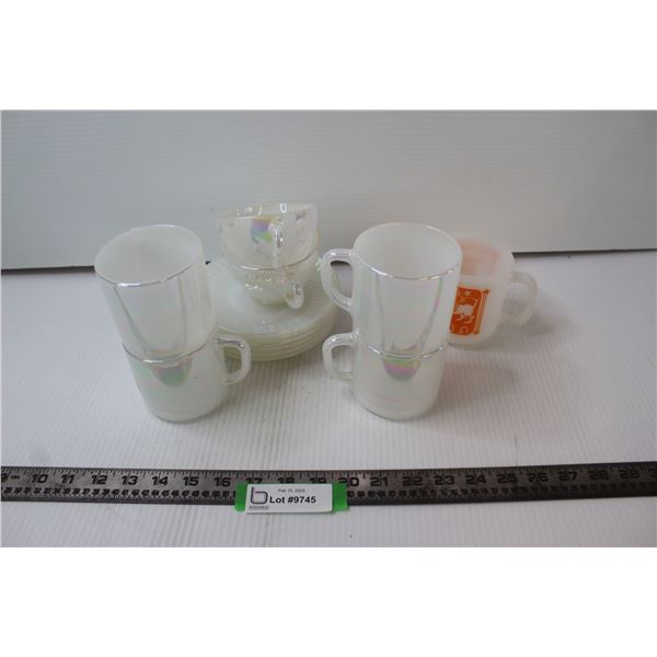 Vintage Federal Iridescent Milk Glass Dishes - (6) Saucers, (4) Mugs, (2) Teacups, One Other Mug