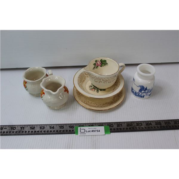 Tiger Lily Cream & Sugar, Tudor Rose Plate, Bowl, & Creamer, Milk Glass Container