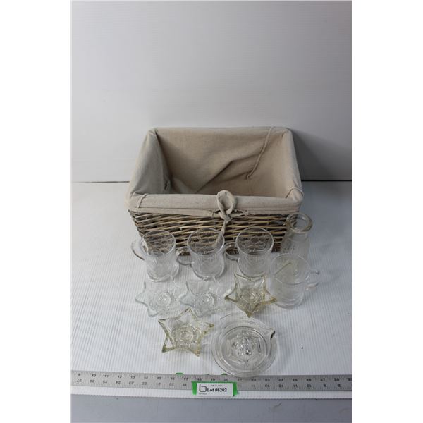 Wicker Basket, Glass Cups, Candle Stick Holders, Glass Juicer