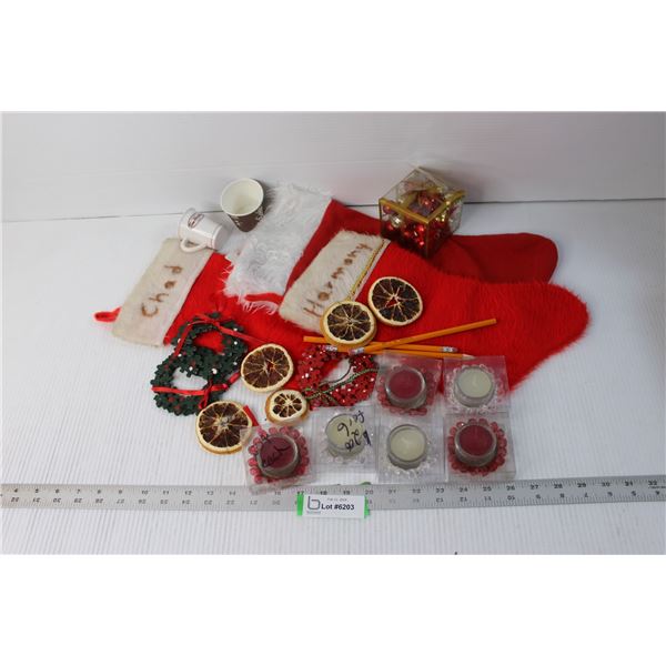Assorted Christmas Items - Stockings, Candles, Ornaments