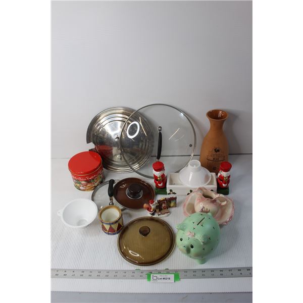 Mini Pitcher and Basin, Piggy Bank, (5) Pot Lids, and Misc.