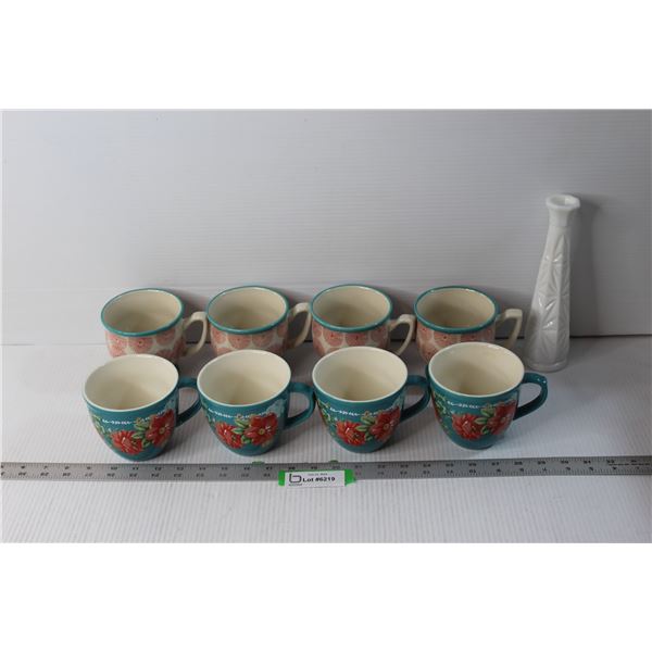 (8) Pioneer Woman Brand Mugs and Milk Glass Vase