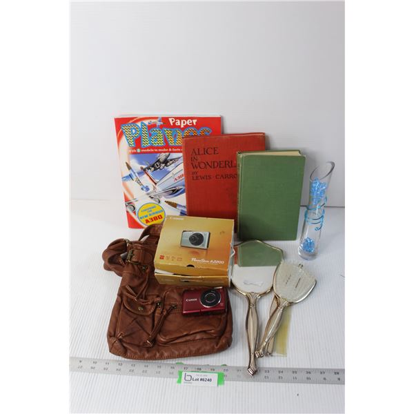 Vintage Vanity Set, (3) Books, Canon Camera, Vase, and Purse