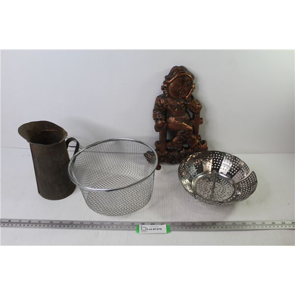 Deep Fryer Basket - Scarecrow Wall Holder - Strainer Vintage Metal Pitcher