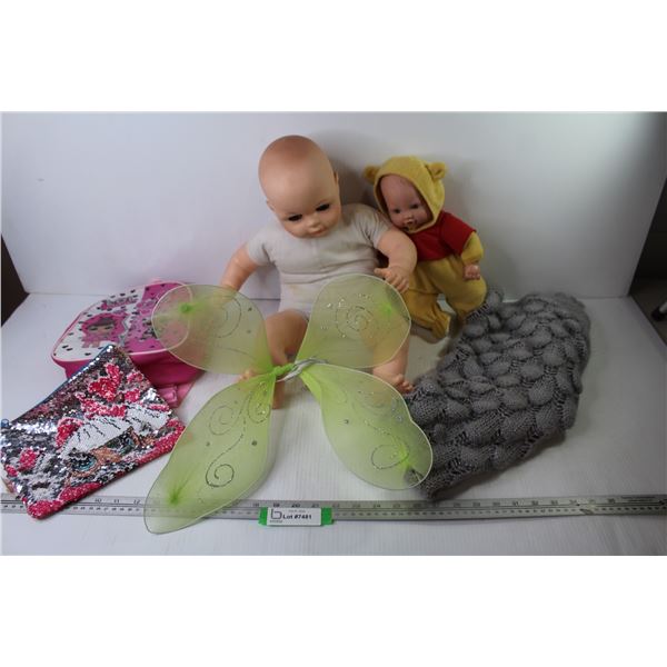 (2) Baby Dolls - Butterfly Wings - Lol Backpack - Glittery Bag - Knitted Mermaid Bottoms