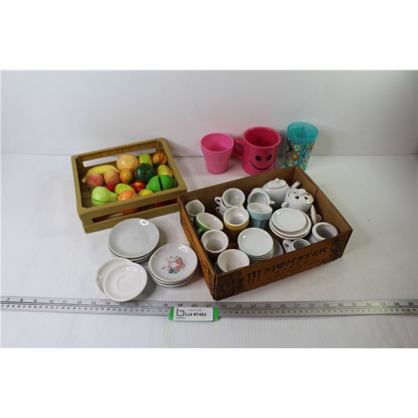 Plastic Cups - Box of Children's Tea Set - Plastic Basket of Plastic Fruit