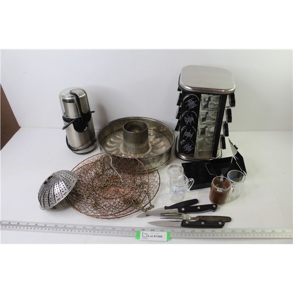 16 Piece Rotating Spice Rack - Hanging Wire Fruit Basket - Kitchen Aid Grinder - Cake Pan - Misc.