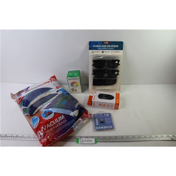 Space Saver Vacuum Storage Bags - Led Bulb - +1.50 Reader Sunglasses - Mixie Mouse - USB Wireless Adapter