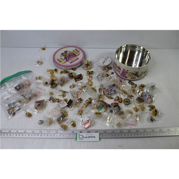 Tin w/large Assortment of Pins (mostly Shriners pins)